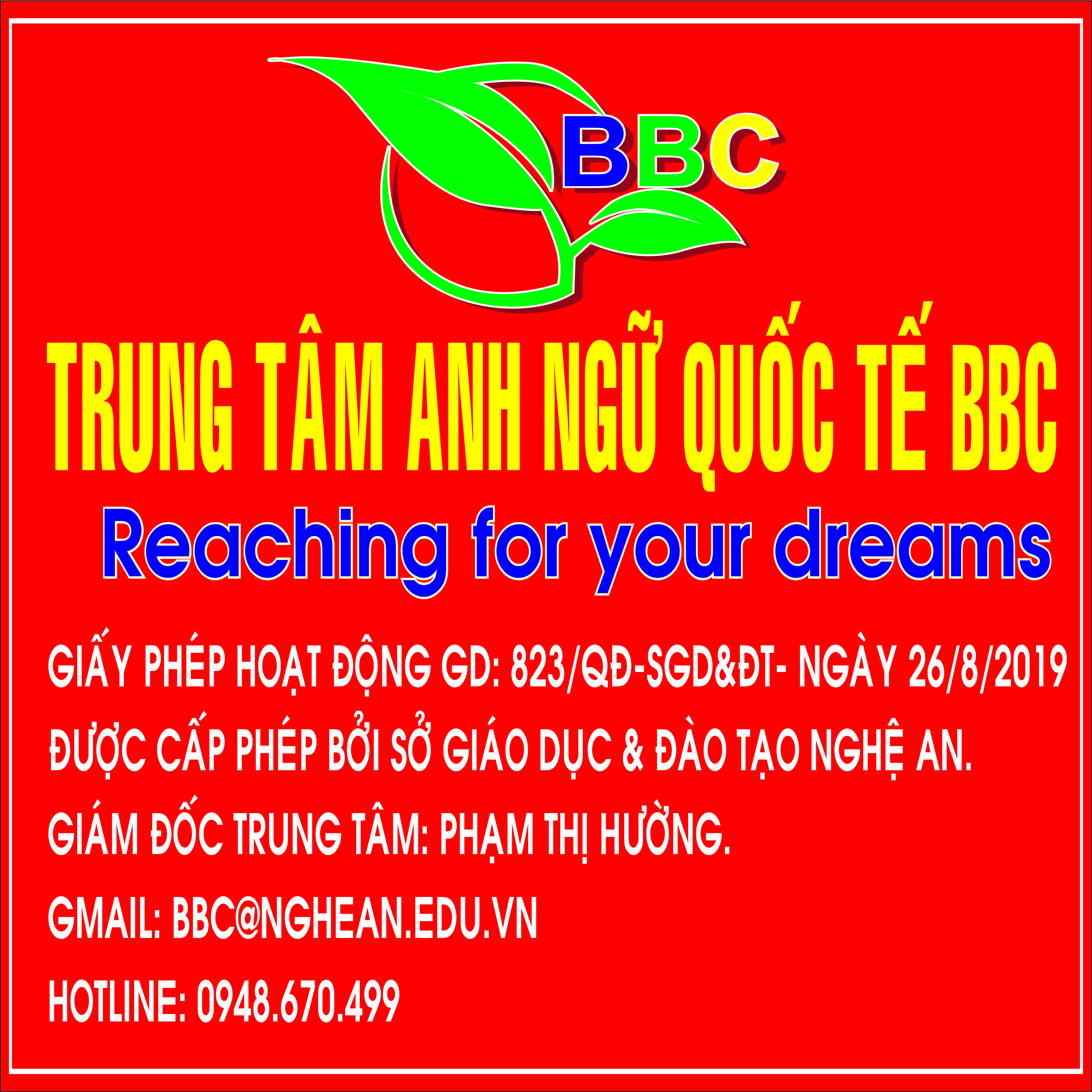 BBC là Trung Tâm Anh Ngữ đầu tiên được mở ra ở một làng quê thuần nông Yên Thành, cuộc sống người dân còn nhiều vất vả. Và chúng tôi luôn nỗ lực thay đổi các học Tiếng Anh theo phương pháp hiện đại, hiệu quả chứ không đi theo lối mòn xưa cũ.