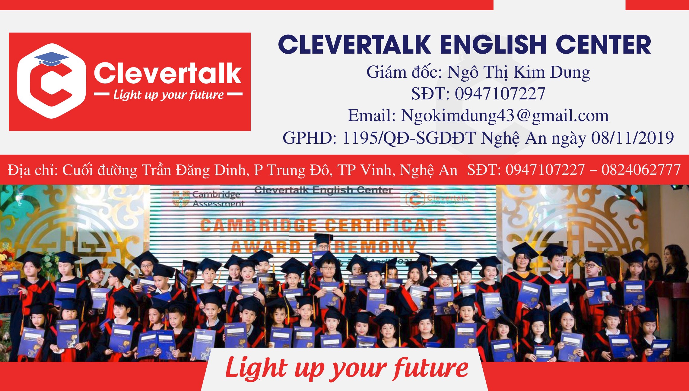 - Trung Tâm Anh Ngữ Clevertalk tiền thân là lớp học Tiếng Anh của cô giáo Ngô Thị Kim Dung ở Số 47, Đường Nguyễn Viết Lục, Phường Trường Vinh, Tỉnh Nghệ An. Clevertalk luôn tự tin là đơn vị hàng đầu đào trong việc giảng dạy Tiếng Anh theo lộ trình Quốc Tế chuẩn Cambridge và luyện thi các Chứng Chỉ Tiếng Anh Quốc Tế như Cambridge, Toefl...